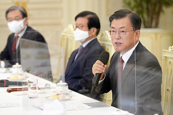 문재인 대통령이 22일 오전 청와대에서 열린 ‘5부요인 초청 간담회’에서 발언하고 있다. (사진=청와대)문 대통령은 “요즘 여러모로 어려운 시기다. 한 해 내내 어려웠는데 한 해의 마지막도 어려운 시기를 계속 겪고 있다”며 “뭐니뭐니 해도 코로나 상황이 어렵고, 그 때문에 우리 경제가 어렵고 소상공인, 자영업자, 청년들, 서민들의 민생이 아주 어렵다”고 밝혔다.