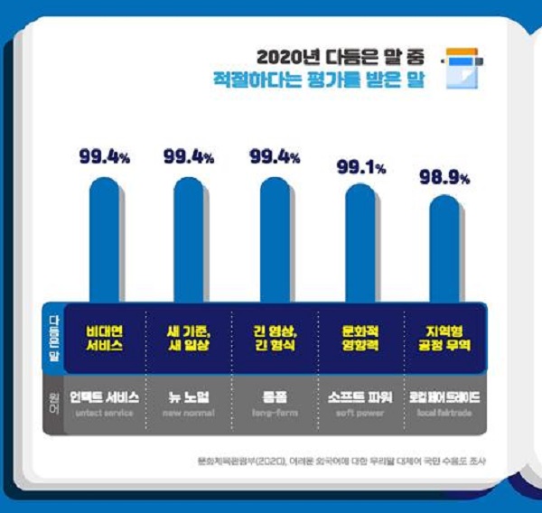 아울러 올해 선정한 다듬은 말의 적절성을 묻는 질문에 ‘비대면 서비스’(← 언택트 서비스)와 ‘새 기준, 새 일상’(← 뉴 노멀), ‘긴 영상, 긴 형식’(← 롱 폼)이 각각 99.4%로 높은 평가를 받았다. 특히 ‘언택트 서비스’의 다듬은 말인 ‘비대면 서비스’는 ‘비대면 소비’, ‘비대면 방식’, ‘비대면 채용’처럼 다양하게 활용할 수 있다.