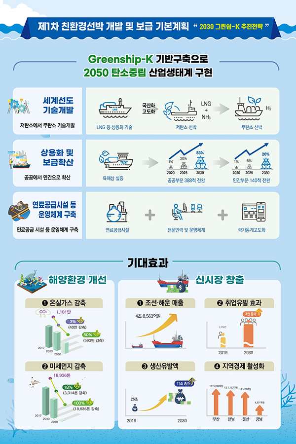 친환경선박 기술 개발·보급을 위한 기본방향을 제시한 이번 기본계획은 그린뉴딜·탄소중립과의 정책연계를 위해 ‘2030 그린십(Green Ship)-K 추진전략’으로 명명됐다