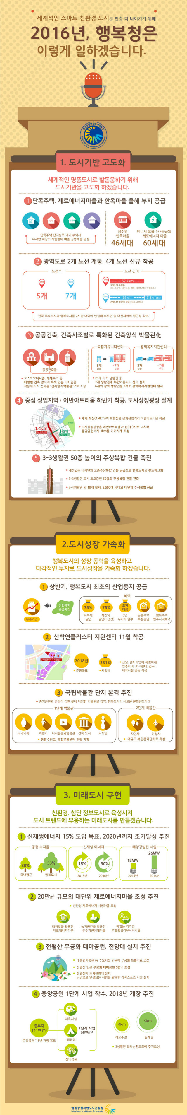 [일간환경연합 신상미 기자]2016년 행복청의 3대 주요과제 ‘도시기반 고도화, 도시성장 가속화, 미래도시 구현’에 대해서 인포그래픽으로 자세히 알려드리겠습니다.
