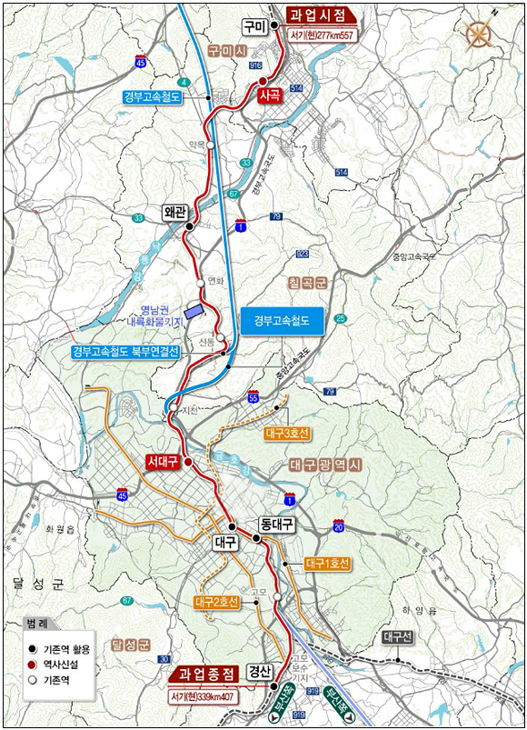 대구권 광역철도는 총 연장 61.8㎞ 구간에 구미·왜관·대구·동대구·경산역 등 기존 5개 역사를 개량하고 사곡·서대구역 등 2개 역을 신설한다. 사업비는 1515억원이다.