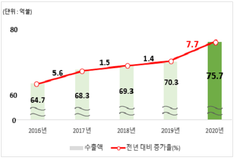 농림축산식품부는 2020년 연간 누계 기준(잠정) 농식품 수출액이 전년 대비 7.7% 증가한 75억 7000만 달러를 기록, 역대 최고 실적을 달성했다고 5일 밝혔다.