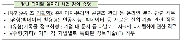 대상 기업이 사업 유형에 부합하는 정보기술(IT) 직무에 청년(만 15~34세)을 채용하고 3개월 이상 근로계약(정규직 포함)·4대 보험 가입 등 근로조건을 충족하면 지원을 받을 수 있다.
