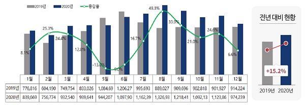 2020년 민원 발생량은 총 1240만 8714건으로, 전년(1076만8138건) 대비 15.2% 증가했고 시기별로는 8월이 132만 6937건으로 가장 많이 발생했다.