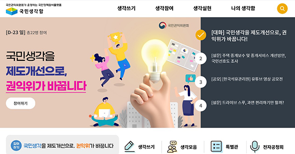 국민권익위원회는 8일부터 ‘국민생각함’에 올라온 국민이 제도개선을 원하는 안건에 대해 의견을 받아 제도개선을 추진하는 등 국민 참여를 강화한다고 밝혔다.