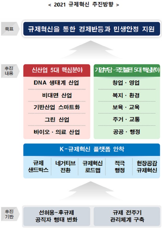 이날 밝힌 규제혁신 추진 방향은 ▲한국형(K) 규제혁신 플랫폼 안착 ▲DNA 생태계, 비대면 산업, 기반산업 스마트화, 그린 산업, 바이오·의료 산업 등 신산업 5대 핵심분야 규제혁신 ▲창업·영업, 복지·환경, 보육·교육, 교통·주거, 공공·행정 등 기업부담·국민불편 5대 핵심분야 규제혁신 ▲규제 전주기 관리체계 구축 등이다.