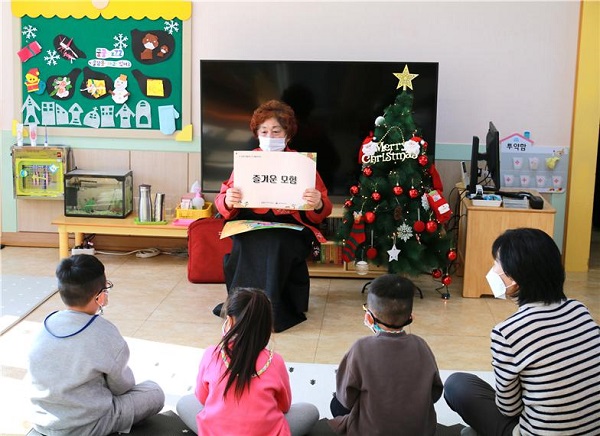 ▲ 조은숙 이야기할머니가 포항시 대보초등학교병설유치원에서 활동하고 있다.지난 2009년부터 시작해 올해로 13년째를 맞이한 ‘아름다운 이야기할머니’ 사업은 전통문화를 매개로 세대 간 소통 기회를 확대하는 데 기여해 왔다.