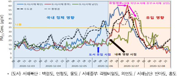 반면, 6일 오후부터는 북서기류를 통한 국외 미세먼지의 유입으로 서해 섬 지역의 농도가 높아(북단→중부→남단)졌다가, 7일 내륙으로 이동하여 수도권, 충청권 순으로 최고 농도가 높아진 것으로 분석된다.