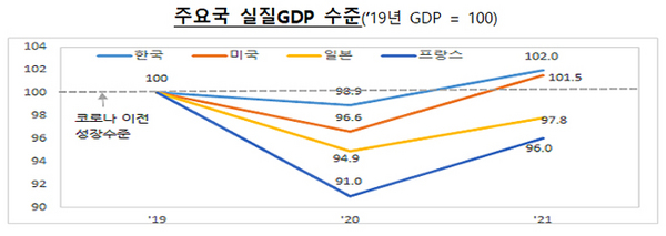 기재부는 “이는 실물경제가 코로나19 이전 수준으로 회복되는 정도 또한 한국이 가장 높을 것으로 전망됨을 의미한다”며 “IMF가 K-방역과 적극적 정책대응 등 코로나19 극복 과정에서의 한국의 대응을 높게 평가한 것”이라고 설명했다.