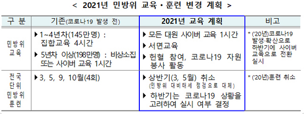 하지만 지난해 코로나19 감염병 발생·확산으로 상반기에 민방위 교육 운영을 중단하고 하반기부터 사이버 교육으로 전환 실시했으며, 전국단위 민방위 훈련은 취소한 바 있다.