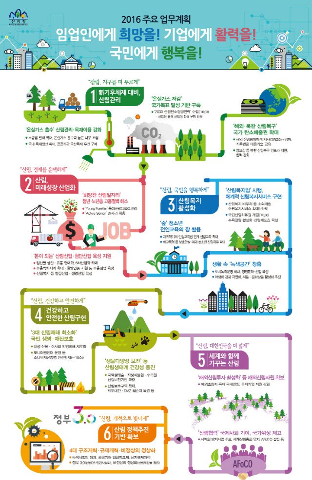 주요 내용으로는 파리협정 타결에 따른 기후변화 대응에 적극 나서기 위해 산림분야 기후변화 대응 종합계획인 '2030 산림탄소경영전략'을 3월 수립해 산림을 통한 온실가스 줄이기에 나선다.