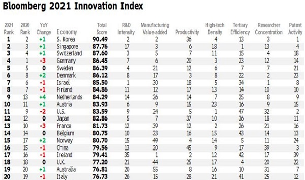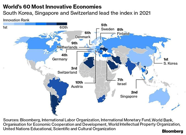 [일간환경연합 장민주 기자]한국이 ‘2021년 블룸버그 혁신지수’ 세계 1위를 차지했다.