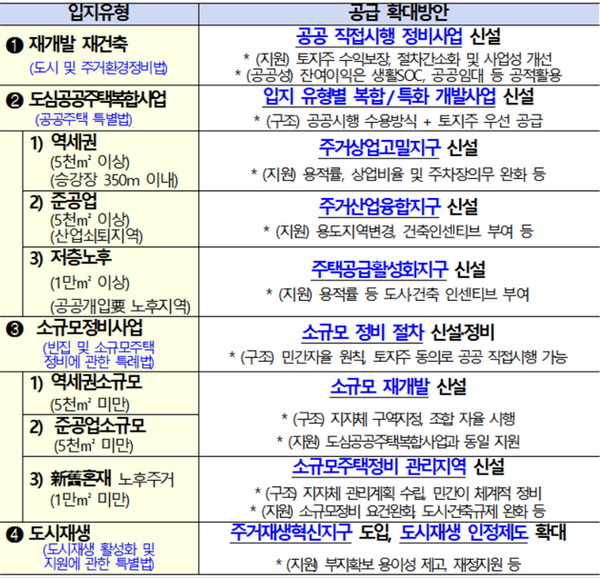 역세권, 준공업지역 중 5000㎡ 미만인 소규모 입지에 대해서는 기존 소규모 정비사업을 개선한 ‘소규모 재개발사업’을 신설, 주택공급을 활성화하고 낙후된 환경도 개선한다.