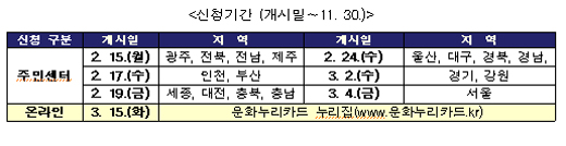 지역 주민센터에서의 카드 발급과 재충전 신청은 15일 광주·전북·전남·제주 지역을 시작으로 3월 4일 서울 지역까지 6개 권역별로 순차적으로 진행된다. 온라인 신청은 3월 15일부터 문화누리카드 누리집(www.문화누리카드.kr)에서 전국적으로 동시에 시작된다.