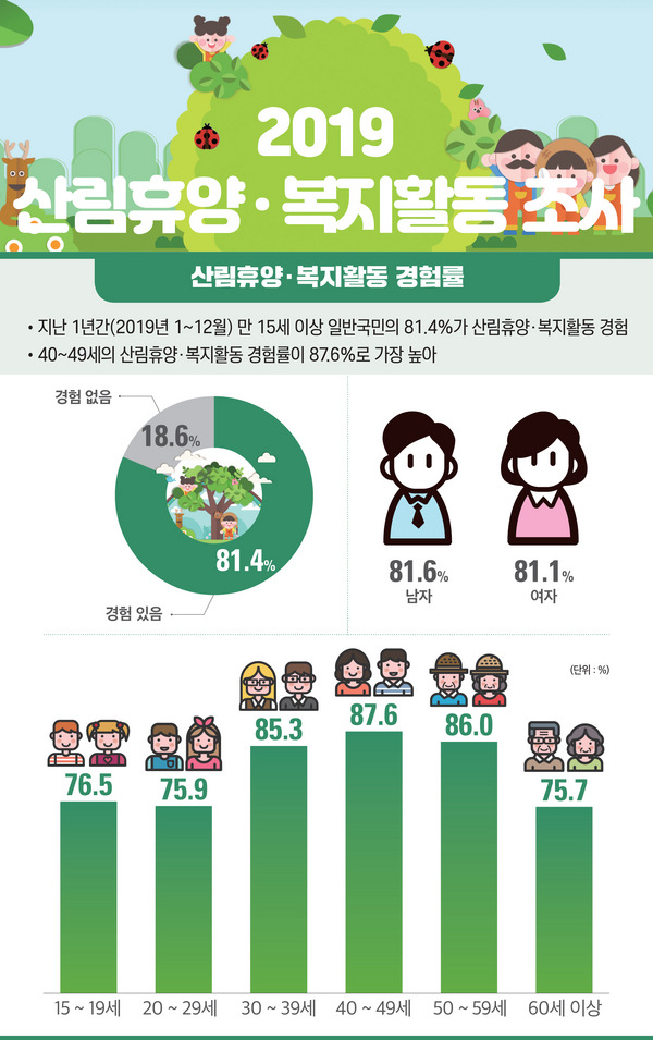 우리나라 만 15세 이상 국민의 81.4%는 산림휴양·복지활동을 경험하였으며, ‘휴양과 휴식’을 위해 산림(숲)을 방문하고, 자연휴양림 시설의 이용경험과 이용의향이 가장 높은 것으로 조사됐다.