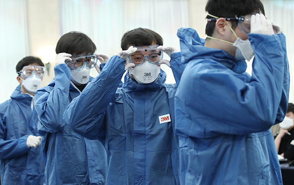 ▲ 지난해 3월 신규 의과 공중보건의사들이 코로나19 현장 배치 대비 직무교육을 받으며 보호장비를 착용하고 있다. (사진=(c) 연합뉴스)지난해 3월 신규 의과 공중보건의사들이 코로나19 현장 배치 대비 직무교육을 받으며 보호장비를 착용하고 있다. (사진=(c) 연합뉴스)
