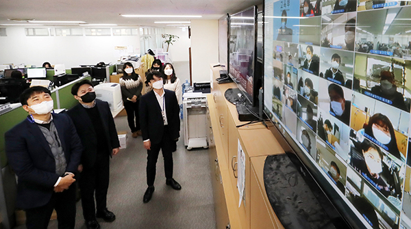 교육부 공무원들이 지난 1월 4일 오전 세종시 정부세종청사에서 비대면 온라인으로 진행된 시무식에서 거리두기 등 방역수칙을 준수하며 유은혜 부총리의 인사말을 경청하고 있다. (사진=(c) 연합뉴스)