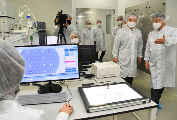 정세균 국무총리가 지난해 10월 30일 코로나 백신개발 현장 방문 일환으로 경북 안동시 SK바이오사이언스를 방문해 실험실 등을 둘러보고 있다.