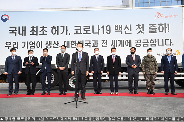 정세균 국무총리는 이날 아스트라제네카 백신을 위탁생산하는 SK바이오사이언스의 경북 안동공장에서 열린 백신 출하식에 참석했다.