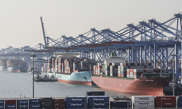 ▲ 부산항 신항 부두에 접안한 컨테이너선에서 분주하게 화물을 선적하고 있다.(사진=(c) 연합뉴스)