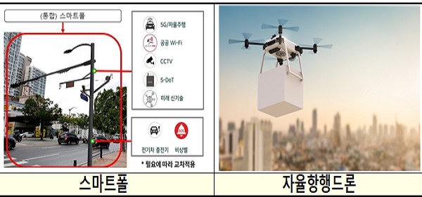 스마트시티 솔루션 7개는 스마트폴, 스마트버스정류장, 스마트횡단보도, 전기안전 모니터링, 공유주차, 수요응답버스, 자율항행드론 등이다.