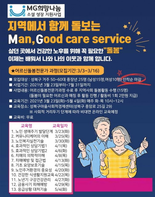 ▲ MG희망나눔 소셜성장 지원사업의 하나로 운영되는 어르신돌봄전문가 과정 안내 포스터