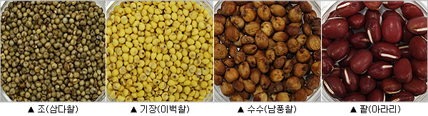 찹쌀은 성질이 따뜻해 소화가 잘되고, 조는 식이섬유와 무기질, 비타민이 풍부하다. 팥은 식이섬유와 칼륨(K)이 풍부해 부기를 빼는데 좋다.
