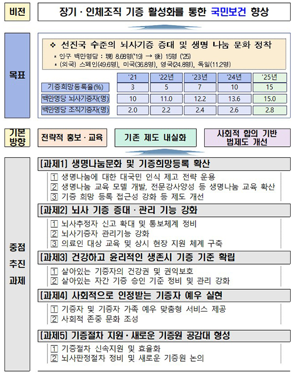 특히 생명나눔 가치와 중요성을 인식할 수 있도록 교육지원체계를 구축하는 등 학교에서 생명나눔 교육을 제대로 할 수 있도록 정부 차원의 지원을 강화한다.