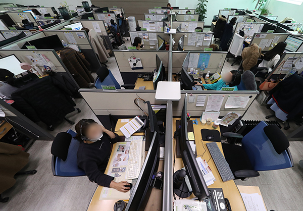 ▲ 경기도 수원시 경기도청 120 경기도 콜센터 모습. 직원들이 코로나19 예방을 위해 옆자리를 비워두고 근무하고 있다. (사진=(c) 연합뉴스)중앙 콜센터 운영 인력은 질병관리청 1339콜센터 310명이 6개 근무조로 24시간 상담하고 국민건강보험공단 등 관계기관 콜센터에서 600여명이 상담 문의 증가상황 등을 고려해 탄력적으로 지원함에 따라 운영인원은 총 900여명이다.