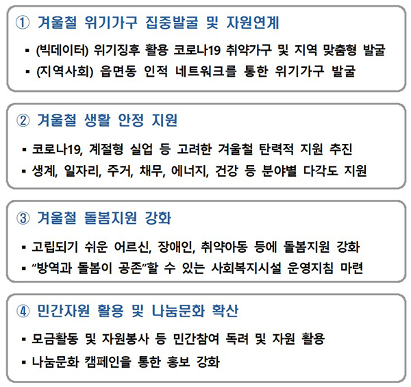▲ 겨울철 복지위기가구 발굴·지원 추진과제.박인석 복지부 사회복지정책실장은 “코로나19라는 어려운 여건 속에서도 위기가구 발굴·지원 규모가 전년에 비해 확대된 것은 지역 사회복지공무원의 노력과 소외된 이웃에 대한 지역사회의 따뜻한 관심이 모여 민·관 협력을 통해 만들어낸 결과”라고 설명했다.