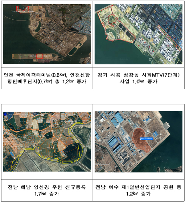 전남 해남 영산강 주변 부지(1.7㎢)와 전남 여수 제1 일반산업단지 공원(1.2㎢), 경기 시흥 정왕동 시화MTV 7단계 사업(11.0㎢), 인천 국제여객터미널(0.6㎢)과 인천 신항 항만배후단지(0.7㎢) 등의 매립이 지난해 이뤄졌다.