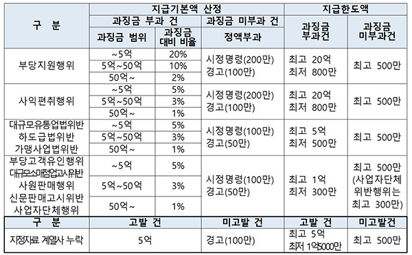 먼저 고발 건은 5억원으로, 미고발(경고) 건은 100만원으로 하고 증거·정보 수준의 최상-상-중-하에 따라 100-80-50-30%로 차등화했다.