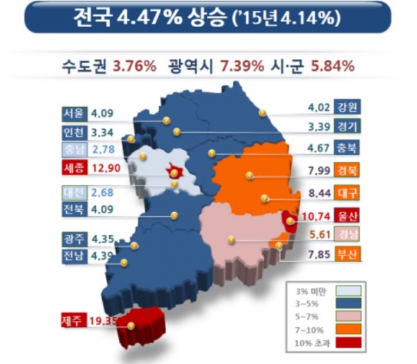 16년도 표준지공시지가는 전년대비 전국 평균 4.47% 올라 전년도 상승률 4.14%에 비해 상승 폭이 다소 증가한 것으로 나타났다.