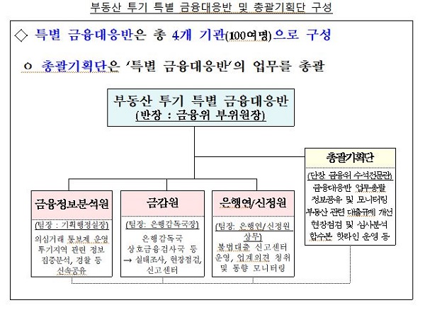 금융위원회는 부동산 투기 특별금융단의 안정적인 운영을 위해 총괄기획단을 8일부터 운영한다고 밝혔다.
