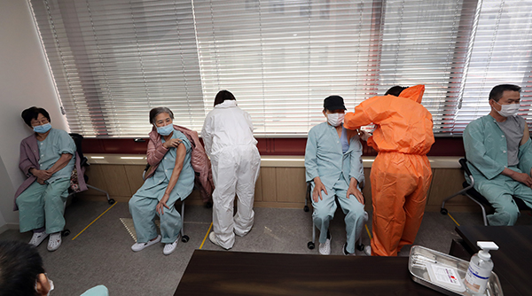 ▲ 지난 3월 23일 오전 광주 북구 동행요양병원에서 환자들이 아스트라제네카(AZ) 백신 접종을 받고 있다. (사진=(c) 연합뉴스)배 총괄반장은 “지난 2월 26일 요양병원과 요양시설에서 예방접종이 처음 시작된 이후 일상 회복을 위해 코로나19 예방접종에 지금까지 100만 명 이상 함께해 주셨다”고 설명했다.