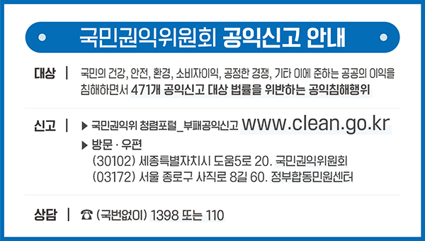 지난해 11월 20일 공익신고 대상은 ▲국민의 건강 ▲안전 ▲환경 ▲소비자이익 ▲공정한 경쟁 ▲이에 준하는 공공의 이익을 침해하는 것으로 규정되면서 대상 법률이 기존 284개에서 역대 최대인 467개로 확대됐다.