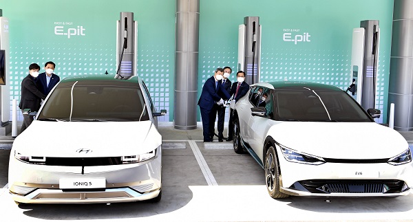 ▲ 박진규 산업통상자원부 차관이 14일 서해안고속도로 목포방향 화성휴게소에서 황성규 국토부 차관, 홍정기 환경부 차관, 공영운 현대차 사장, 김일환 도로공사 부사장 등 관계자 30여명이 참석한 가운데 현대차 초고속 전기차 충전서비스(E-pit) 개소식에 참석해 EV6을 충전하고 있다. (사진=산업통상자원부)E-pit서비스는 모터스포츠 레이싱에서 급유, 타이어 교체 등을 위해 정차하는 pit-stop의 개념에서 유래했다.