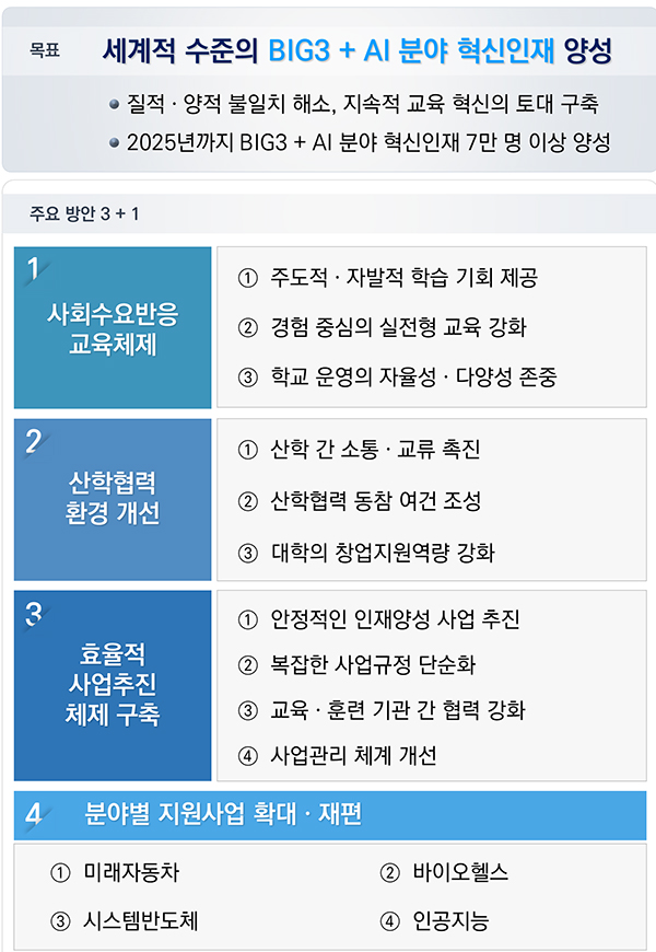 빅3는 혁신성장산업으로 집중 육성 중인 미래차·바이오헬스·시스템반도체 분야로, 이를 위해 정부는 사람투자·인재양성 협의회 산하 특별팀(TF)을 운영해 관련 정책을 점검하고 기업·대학 등 현장 의견을 수렴했다.