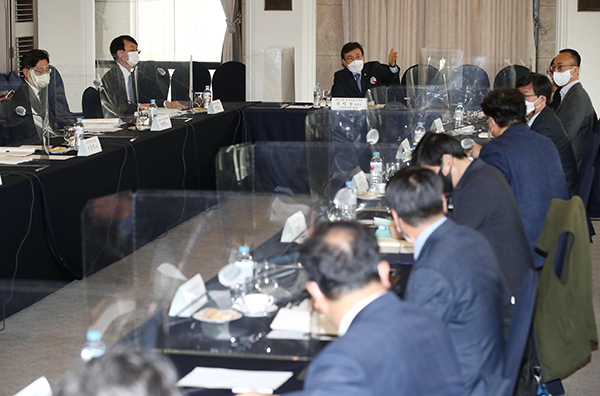 ▲ 16일 오후 서울 중구 프레스센터에서 열린 ‘제5기 제약산업 육성·지원 위원회’ 2021년도 제1차 위원회의에서 위원장을 맡은 권덕철 보건복지부 장관(뒷줄 가운데)이 인사말을 하고 있다.(사진=(c) 연합뉴스)이날 위원회는 2021년 제약산업 육성·지원 시행계획과 혁신형 제약기업 관련 사항 등을 심의하고, 올해 코로나19 치료제·백신 개발 지원전략과 국가신약개발사업 비전 등을 보고받았다.