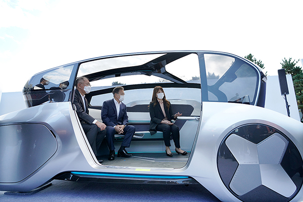 ▲ 문재인 대통령이 지난해 10월 한국판뉴딜 7번째 현장으로 현대자동차 울산공장을 방문, 자율주행 기반 콘셉트카를 시승하고 있다.(사진=청와대)정부는 올해부터 레벨3 자율주행차가 본격 출시되는 등 기술개발에 따라 자율주행 버스·택시·배송 등의 서비스 시장도 급성장할 것으로 예상하고 있다. 특히, 2030년에는 버스의 50%, 택시의 25%가 자율주행차로 운영될 것으로 전망된다.