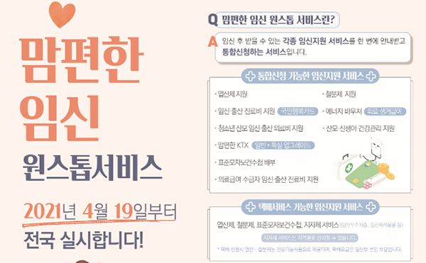 때문에 정부는 이러한 저출산 문제를 극복하고 아이 낳아 키우기 좋은 환경을 만들기 위해 지난해 6월부터 20개 시·군·구를 대상으로 ‘맘편한 임신’ 통합제공 서비스를 시범 도입해 운영하고 있다.