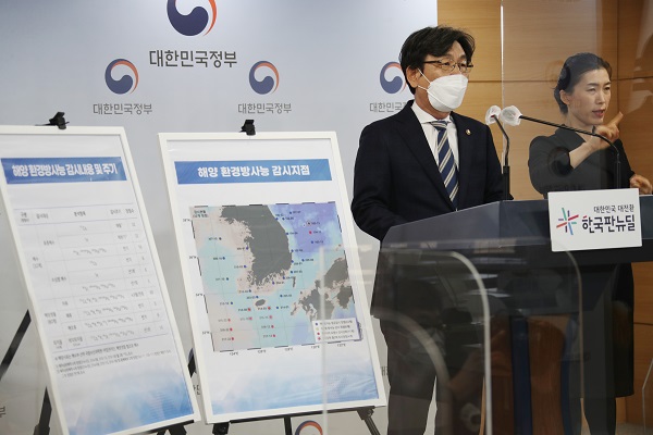 ▲ 지난 14일 엄재식 원안위원장이 정부서울청사 브리핑실에서 해수 방사능 분석결과 등에 대한 정보공개 강화를 실시한다고 밝히고 있다.(사진=(c) 연합뉴스)앞서 원안위는 지난 14일에도 일본 정부의 오염수 해양방출 방침 결정에 대한 강한 우려를 전달했고 도쿄전력의 처분계획에 대한 객관적이고 독립적으로 심사와 신속·투명한 정보공개를 요구한 바 있다.
