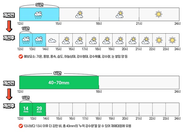 그동안 단기예보는 3시간 단위(9시·12시…)로 확인할 수 있었으나, 국민이 일상에서 더욱 유용한 날씨 정보를 원함에 따라 오는 27일부터 1시간 단위(9시·10시·11시·12시…)로 매시간 상세하게 알 수 있도록 개선한다.