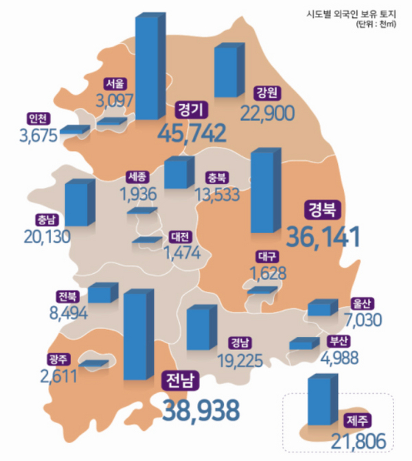 이어 전남 3894만㎡(15.4%), 경북 3614만㎡(14.3%), 강원 2290만㎡(8.6%), 제주 2181만㎡(8.8%) 순으로 외국인 보유 면적이 큰 것으로 나타났다.
