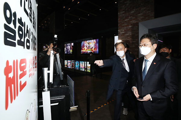 ▲ 황희 문화체육관광부 장관이 지난 3월 3일 오전 서울 용산구 CGV용산아이파크몰을 찾아 코로나19 대응 상황 현장 점검을 하고 있다. (사진=(c) 연합뉴스)그동안 시설별 장관 책임제는 21개 부처에서 운영계획을 수립했고, 법무부·복지부·문체부·식약처 등 4개 부처는 지난 15일부터 19일까지 소관 시설 278곳을 점검해 방역수칙 미준수 사항에 대해 25건의 행정지도를 실시했다.