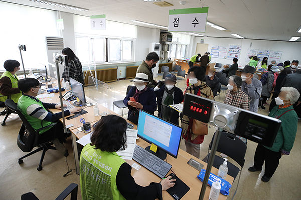 ▲ 서울 강서구 코로나19 백신 예방접종센터에서 어르신들이 접종 접수를 하고 있다. (사진=(c) 연합뉴스)그동안 질병관리청과 행정안전부는 자치구 220개를 기준으로 시·군·구에 1곳 이상의 예방접종센터 설치를 위해 매주 지역예방접종센터 확대에 노력해 왔다.