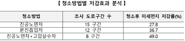 도로 청소에 투입되는 차량 유형에 따라 평균 저감율을 보면 진공노면차 투입은 27.8%, 분진흡입차는 36.7%, 진공노면차와 고압살수차 복합 투입은 49%로 나타났다.