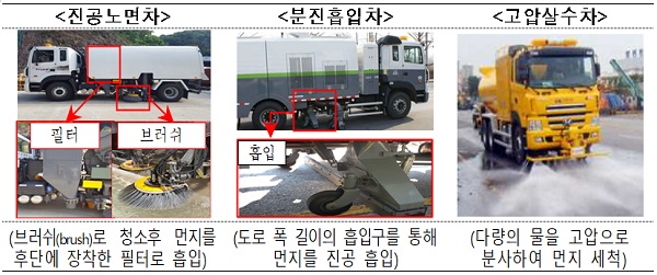 도로 청소에는 진공노면차, 분진흡입차, 고압살수차 등이 사용됐다. 올해 3월 기준으로 전국의 도로 청소 차량은 진공노면차 982대, 분진흡입차 267대, 고압살수차 412대 등 총 1661대가 있다.