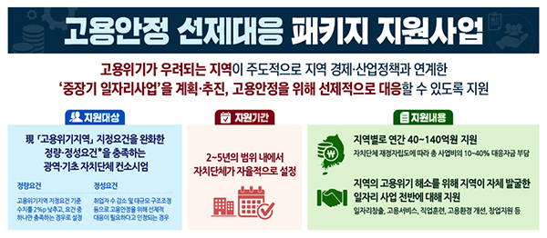 [일간환경연합 김경훈 기자]정부가 고용위기가 우려되는 지역이 주도적으로 중장기 일자리사업을 추진하도록 해 위기에 선제적인 대응을 할 수 있도록 ‘고용안정 선제대응 패키지’ 사업을 추진한다.