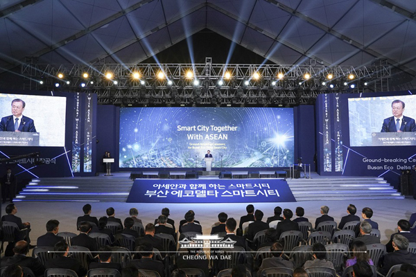 ▲ 지난 2019년 11월 부산 강서구 에코델타시티 부지에서 열린 에코델타 스마트시티 국가시범도시 착공식에서 문재인 대통령이 축사를 하고 있다.(사진=청와대)스마트도시 인증제는 스마트도시 성과 지표를 통해 국내 스마트도시들의 수준을 파악하고 도시 간 비교가 되도록 ‘인증’과 ‘등급’을 부여하는 제도다.